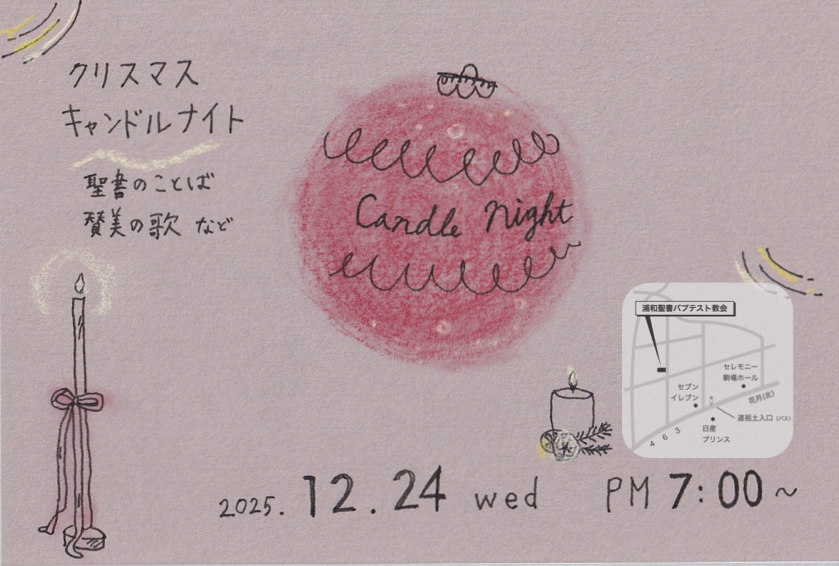 12月24日(火)クリスマス・キャンドルナイトのおしらせ お知らせ 2025/12/10 キャンドルナイト 【日時】12月24日(火曜日) 19:00〜 【場所】浦和聖書バプテスト教会 キャンドルの灯りのなか、クリスマスの賛美とメッセージを味わうひとときです。