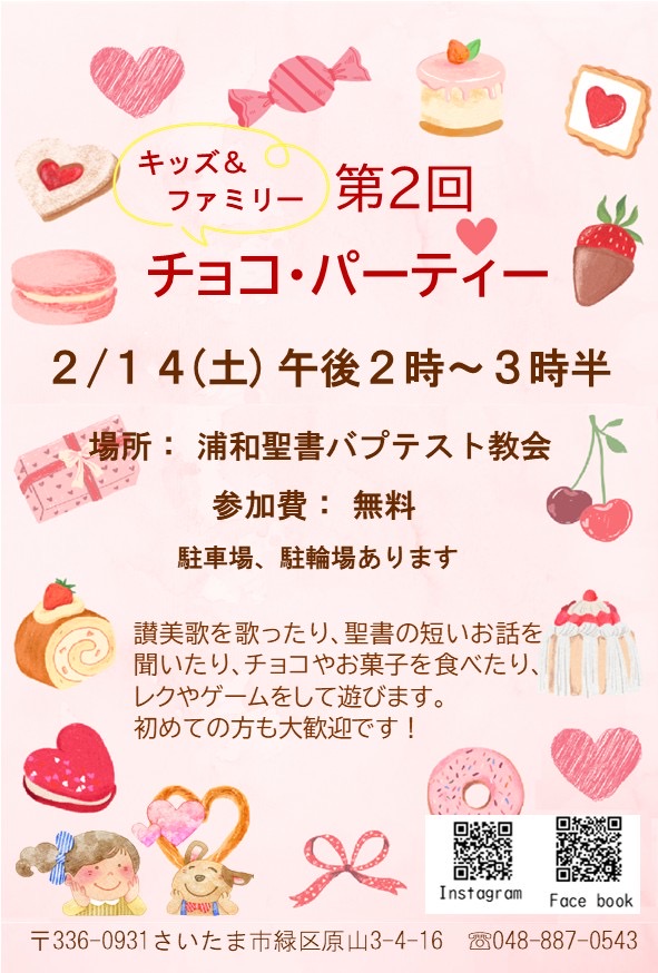 2月14日(土)【キッズ&ファミリー】チョコ・パーティーのご案内 お知らせ 2026/1/12 第2回【キッズ&ファミリー】チョコ・パーティー 【日時】2月14日(土曜日) 14:00〜15:30 賛美の歌 聖書のお話 チョコやお菓子タイム レクやゲーム 参加費無料です 初めての方もぜひいらしてください♪ 駐車場あり ※はじめての方へ