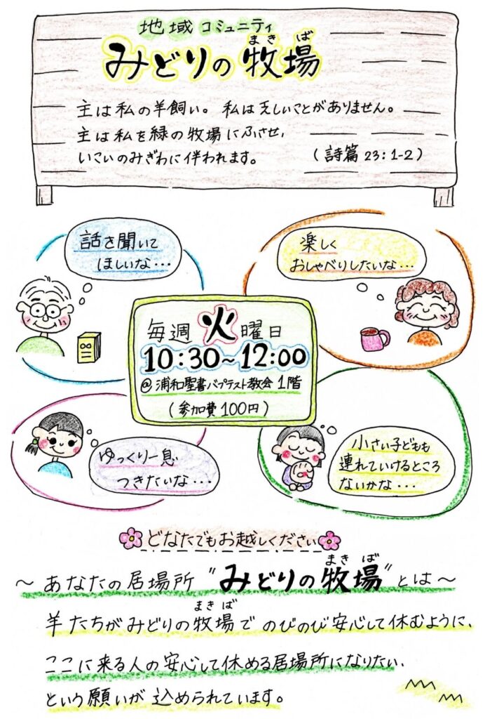 羊たちがみどりの牧場でのびのび安心して休むように、ここに来る人の安心して休める居場所になりたいという願いが込められています。